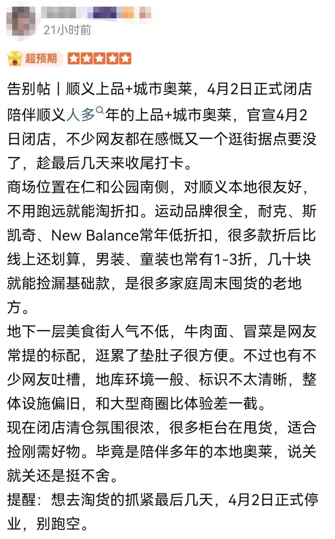 目前,在大众点评上,该商场评分为3.9分。有网友发布告别帖称:“现在闭店清仓氛围很浓,很多柜台在甩货,适合捡刚需好物。毕竟是陪伴多年的本地奥莱,说关就关还是挺不舍”。