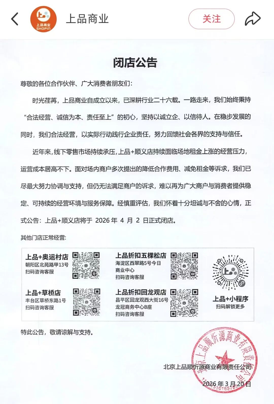 公告内容显示:近年来,线下零售市场持续承压,上品+顺义店持续面临场地租金上涨的经营压力,运营成本居高不下。面对场内商户多次提出的降低合作费用、减免租金等诉求,我们已尽最大努力协调与支持,但仍无法满足商户的诉求,难以再为广大商户与消费者提供稳定、可持续的经营环境与服务保障。经慎重评估,我们怀着十分坦诚与不舍的心情,正式公告:上品+顺义店将于2026年4月2日正式闭店。