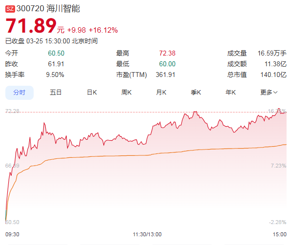 3月25日,海川智能强势上涨超过16%,收盘价为71.89元,成交额为11.38亿元,总市值攀升至140.10亿元。据统计,自2026年2月24日以来的22个交易日内,海川智能股价累计涨幅超过125%,表现非常亮眼。