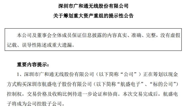 据公告,经初步测算,本次交易预计将构成重大资产重组及港交所相关规则下的“主要交易”。不过,本次交易拟采用现金方式,不涉及公司发行股份,不构成关联交易,也不会导致上市公司控制权的变更。需要指出的是,本次筹划事项公司股票不停牌,广和通将根据相关事项的进展情况,分阶段及时履行信息披露义务。