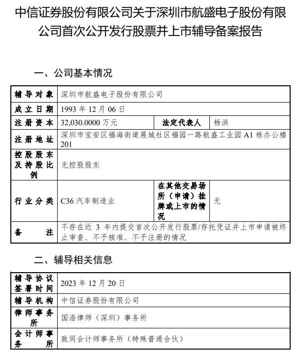 还需要指出的是,航盛电子此前一直在谋求独立上市。2023年12月,中信证券曾与航盛电子签署了辅导协议,并向深圳证监局报送了IPO(首次公开发行)股票并上市的辅导备案申请。整个2024年上半年,中信证券、致同会计师事务所等机构一直在对其进行密集的IPO辅导和财务核查。