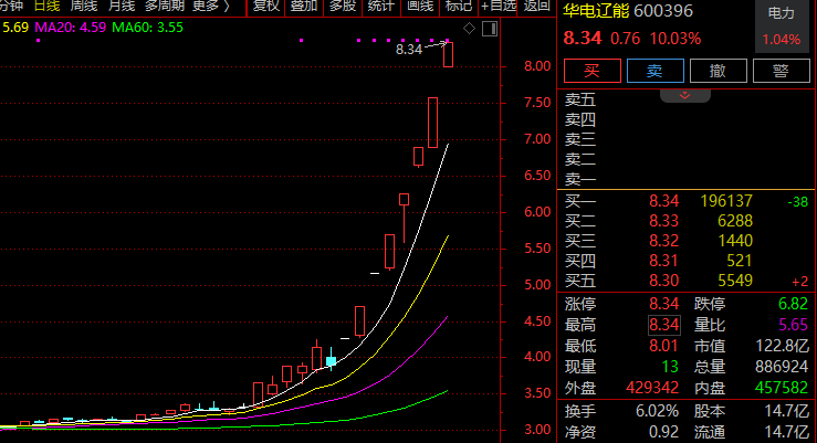 华电辽能( 600396 )涨停走出 8 连板, 8 天累计涨幅超 110% 。