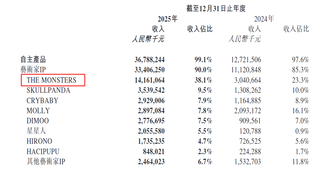 从IP结构来看,LABUBU家族(THE MONSTERS)无疑是全年最大亮点。该IP实现营收141.6亿元,同比增长365.7%,占总营收比重从2024年的23.3%跃升至38.1%,首次突破百亿大关,但非Labubu IP产品销售额未达预期。