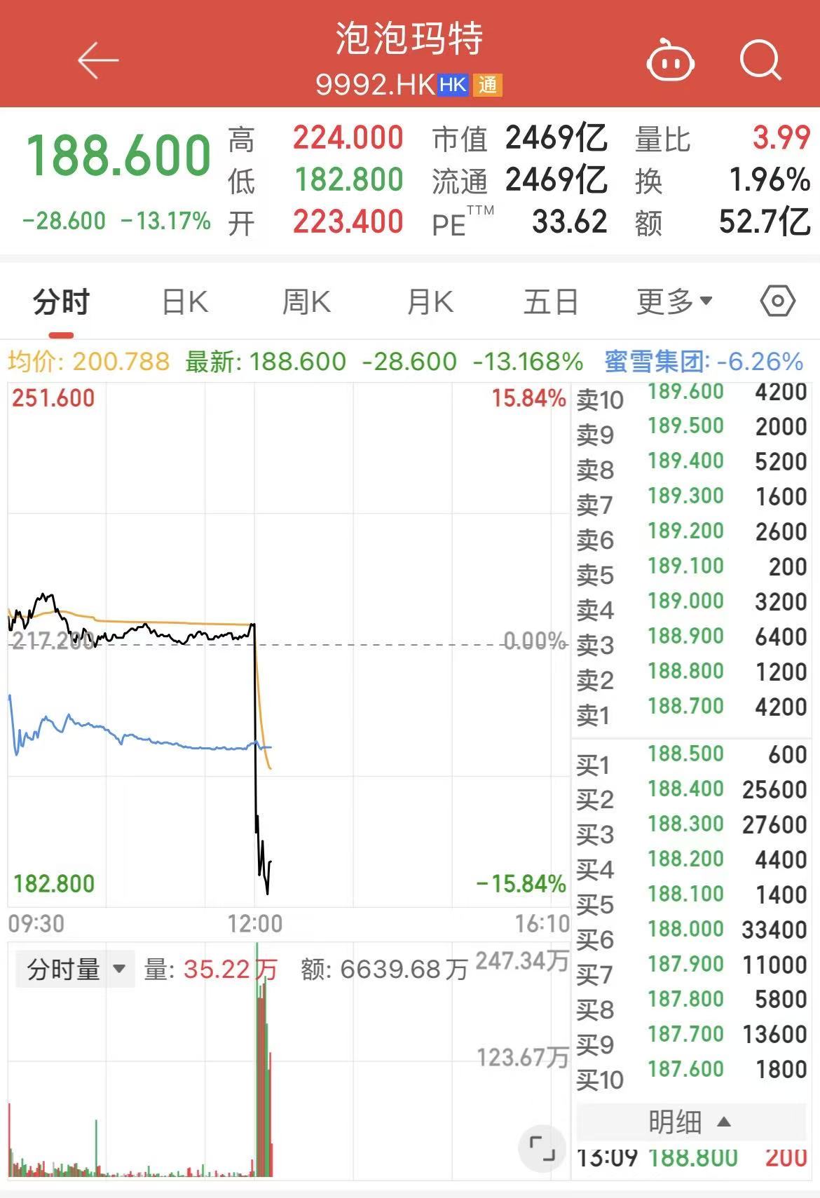 3月25日,泡泡玛特午后开盘股价直线跳水,盘中一度下跌15.84%,为去年4月7日以来盘中最大跌幅。截至13:09分,报188.6港元/股,跌幅达13.17%。