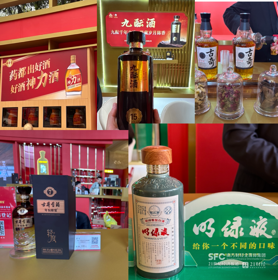 21世纪经济报道记者在现场看到,今年古井贡酒不仅继续携旗下古井贡酒、黄鹤楼和今年春节走红的明绿液参展,还带来了酝酿多年的酱酒品牌“九酝酒”、今年新推出的养生露酒“古井贡·神力酒”以及尚未上市的草本威士忌“古奇”首次亮相,古井贡近年打造的轻养社也将打酒铺、东方草本茶等线下场景搬到了现场,产品品类是历年来最全的一届。