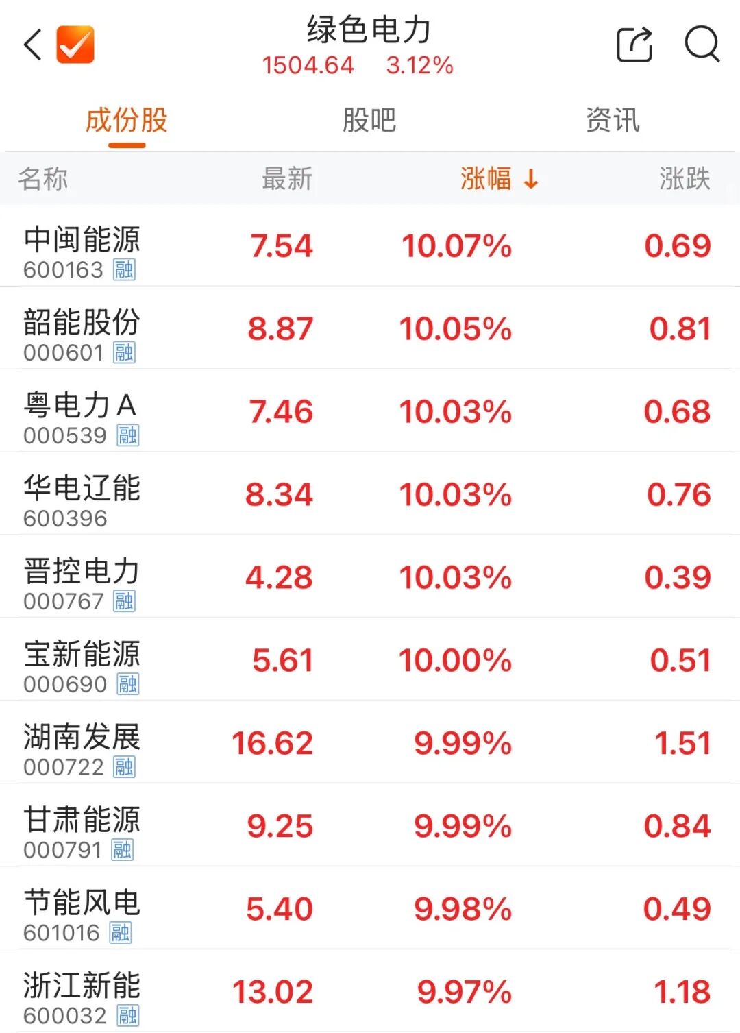 早盘,电力股延续强势,绿电概念涨势扩大。截至午间收盘,中闽能源、韶能股份、粤电力A等十余只个股涨停。
