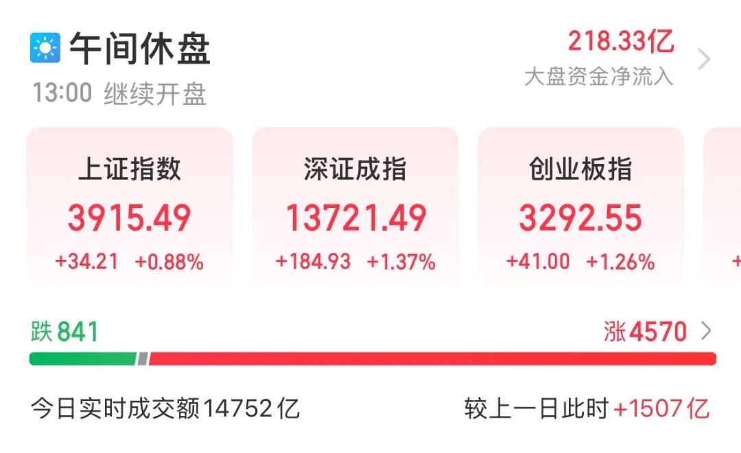 3月25日早盘,A股市场持续反弹,沪指重回3900点上方。截至午间收盘,上证指数报3915.49点,涨0.88%;深证成指涨1.37%,创业板指涨1.26%,科创综指涨1.06%。沪深北三市半日成交14752亿元,较上个交易日同期放量1507亿元。新易盛半日成交160.43亿元,位居A股第一。