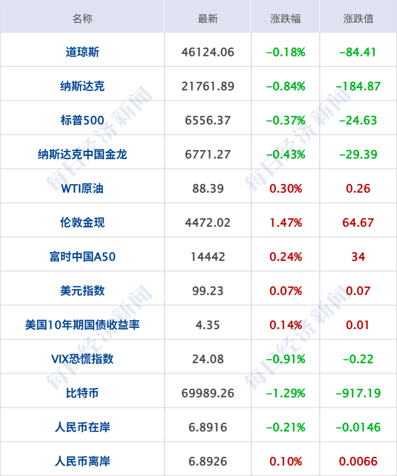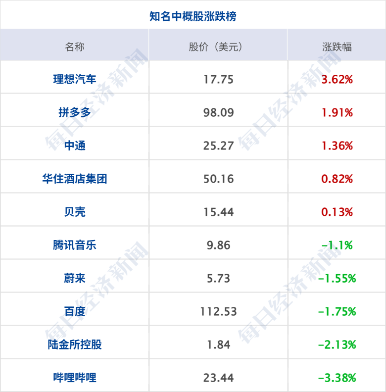 美股三大指数集体收跌,道指跌0.18%,标普500指数跌0.37%,纳指跌0.84% ;谷歌、IBM跌逾3%,软件股大幅下挫,赛富时跌超6%,Adobe跌超3%,微软跌超2%。 中概股多数下跌,纳斯达克中国金龙指数跌0.43% ,禾赛科技跌超14%,汽车之家、哔哩哔哩跌逾3%,奇富科技跌近3%,晶科能源涨超6%,理想汽车涨逾3%。