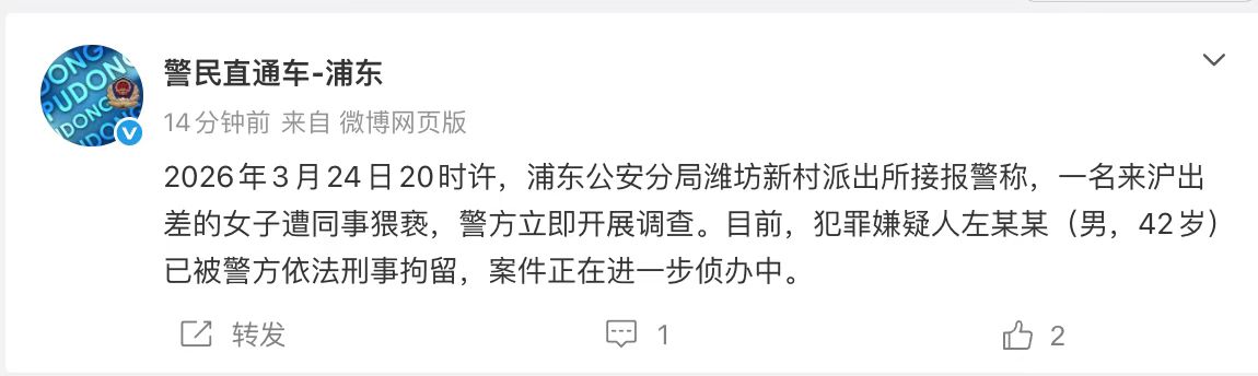 3月25日晚间,上海警方微博号“警民直通车—浦东”发文称:2026年3月24日20时许,浦东公安分局潍坊新村派出所接报警称,一名来沪出差的女子遭同事猥亵,警方立即开展调查。目前,犯罪嫌疑人左某某(男,42岁)已被警方依法刑事拘留,案件正在进一步侦办中。