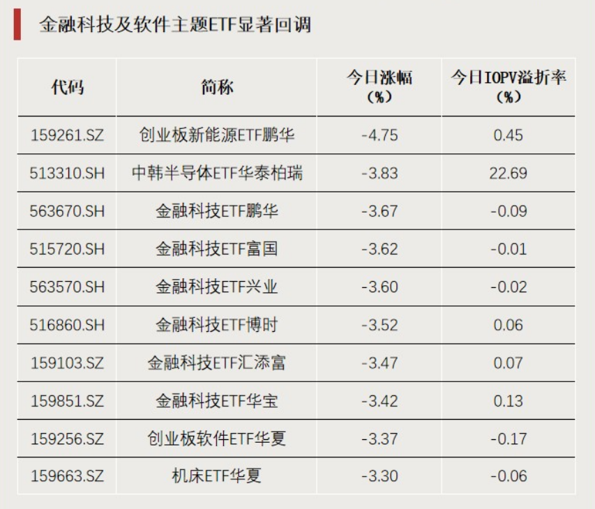 软件、贵金属等板块今日回调幅度较大,多只金融科技、软件、云计算主题ETF跌超3%;中韩半导体ETF华泰柏瑞(513310)跌超3%, 溢价率超 22%。