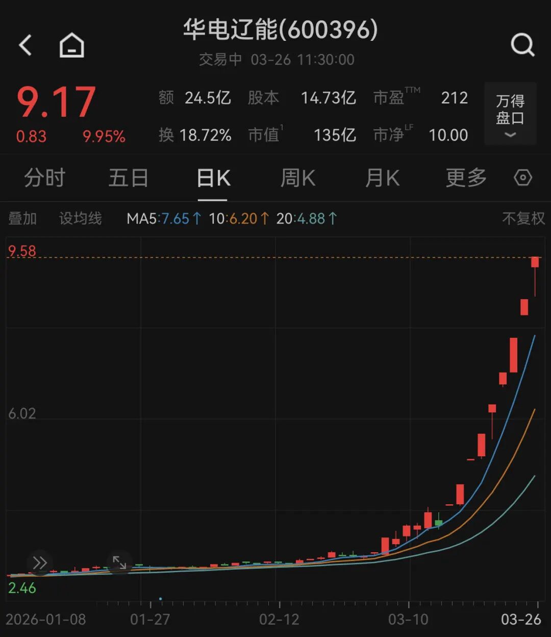 此外,电力板块表现活跃,其中,华电辽能(600396)连续9个交易日涨停,此外,惠天热电、广西能源、京运通、深南电A等近10股亦涨停。