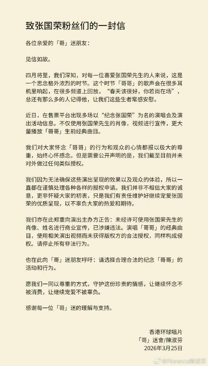 3月25日晚,香港环球唱片与张国荣先生挚友、前经纪人陈淑芬携手发布了一封致张国荣粉丝们的信。