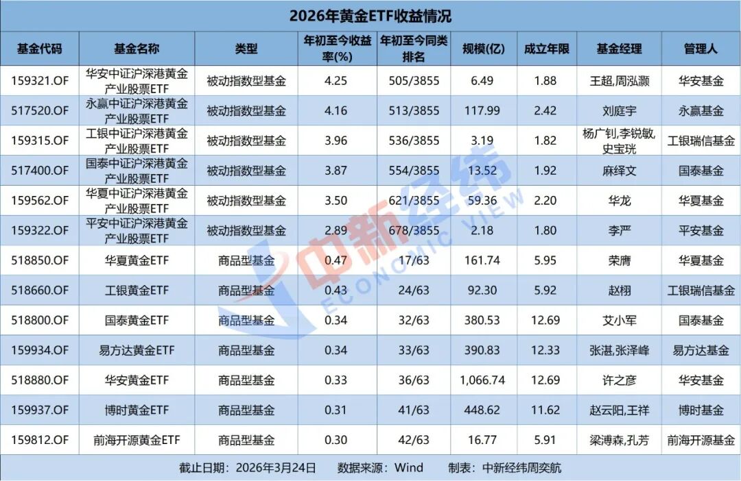 在商品型ETF基金中,由华安基金旗下许之彦管理的华安黄金ETF是中国目前规模最大的黄金主题ETF基金。该基金成立于2013年,总规模为1066.74亿元。Wind数据显示,截至3月23日,该基金年内收益率为-5.12%,当日流通规模减少143.13亿元。