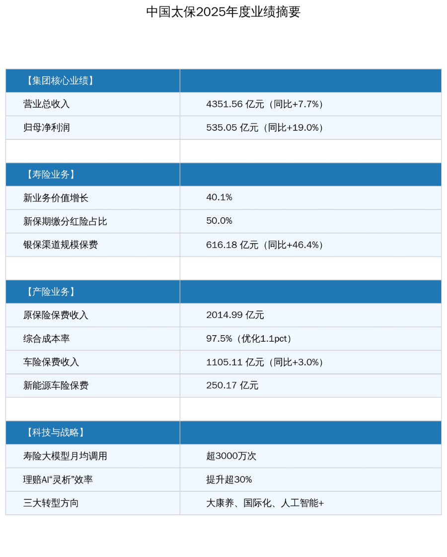 2026年3月26日,中国太平洋保险(集团)股份有限公司(以下简称“中国太保”,股份代码:A股601601,H股02601)公布截至2025年12月31日的全年业绩。2025年,集团实现营业总收入4351.56亿元,同比增长7.7%;归母净利润535.05亿元,同比增长19.0%。