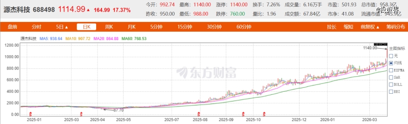 上周五(3月20日),科创板上市公司源杰科技股价成功突破1000元,创下该股历史新高,收盘市值高达958亿元。至此,A股市场迎来2026年首只新晋千元股。
