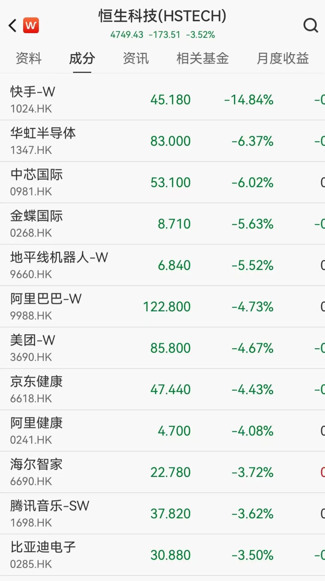 科网股集体大跌,快手大跌超14%,华虹半导体、中芯国际跌超6%,阿里巴巴跌近5%,美团、京东健康、阿里健康跌超4%。