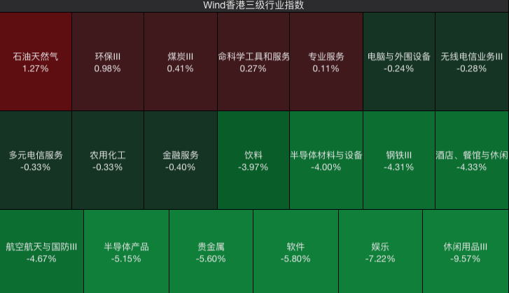 分板块来看,Wind香港三级行业板块中,传统能源和公用事业板块相对抗跌,涨幅前三包括Wind香港石油天然气(+1.27%),Wind香港环保Ⅲ(+0.98%),Wind香港煤炭Ⅲ(+0.41%);科技和消费板块则大幅回调,跌幅前三板块为Wind香港休闲用品Ⅲ(-9.57%),Wind香港娱乐(-7.22%),Wind香港软件(-5.8%)。