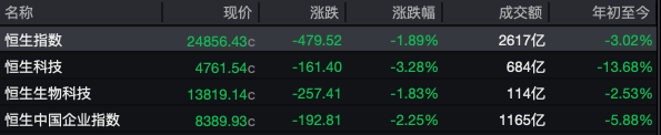 3月26日,香港股市震荡下行。恒生指数收盘报24856.43点,下跌1.89%,本月第二次失守25000点关口,全日成交额约2616.62亿港元,较前一交易日有所缩量。科网股表现更弱,恒生科技指数收报4761.54点,重挫3.28%。