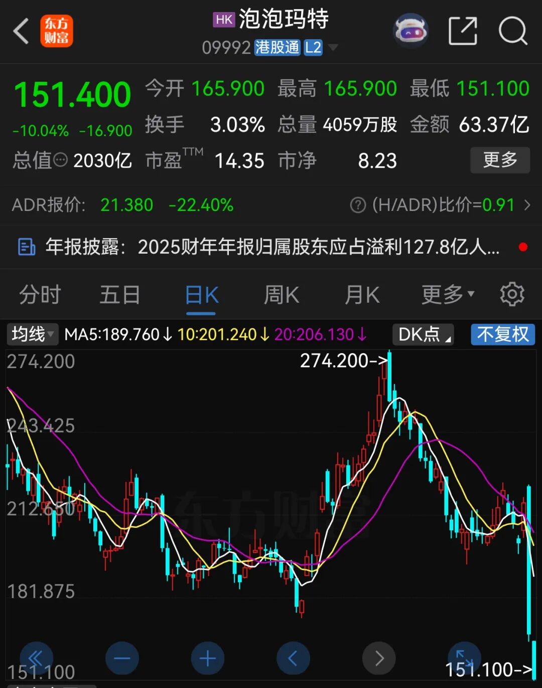 今日早盘,泡泡玛特(09992.HK)延续昨日跌势,股价大跌10%,加上昨日跌幅,2个交易日股价跌去30%。