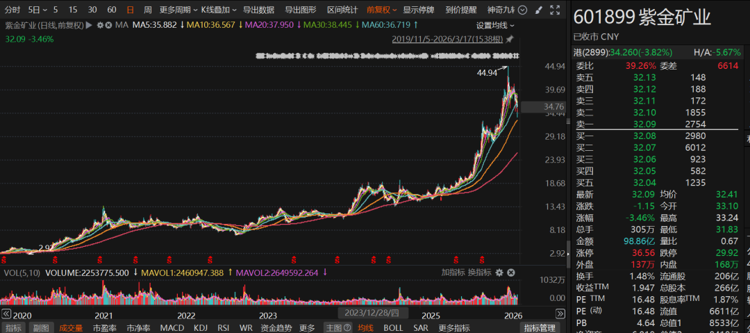 从紫金矿业的年内走势看,自1月30日以来,股价遭遇调整,截至3月26日,紫金矿业股价下跌超过26%。
