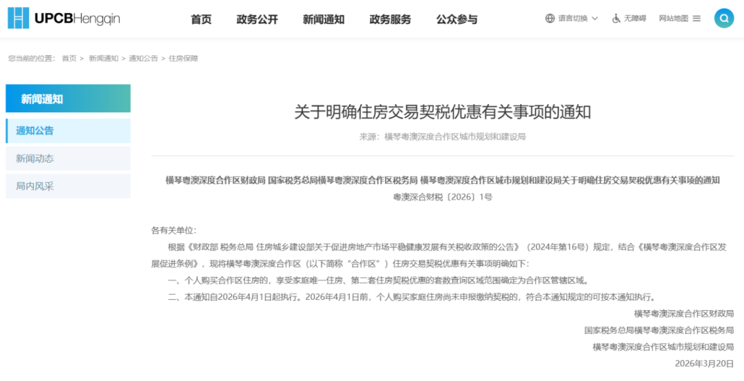 《通知》指出,2026年4月1日起,个人购买合作区住房的,享受家庭唯一住房、第二套住房契税优惠的套数查询区域范围确定为合作区管辖区域。