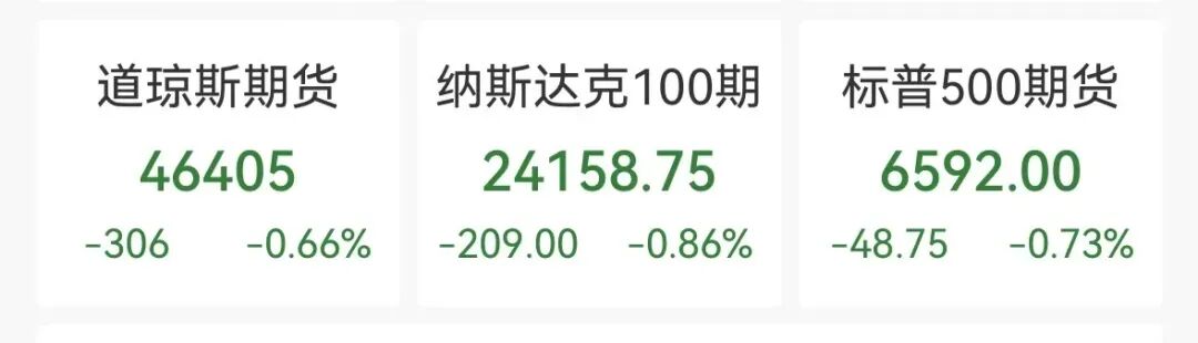 美国股指期货全线下挫,截至发稿, 道琼斯指数期货跌0.66%,纳斯达克100指数期货跌0.86%, 标普500指数期货跌0.73%。