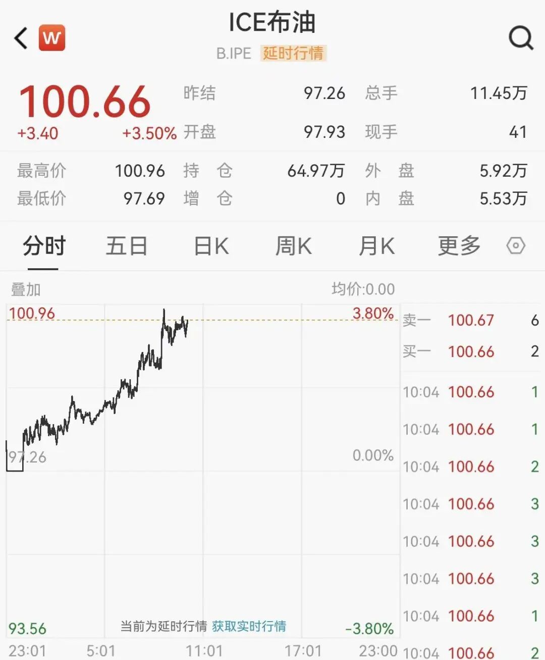 国际油价持续拉升,美油、布油均涨超3%,布油站上100美元/桶。