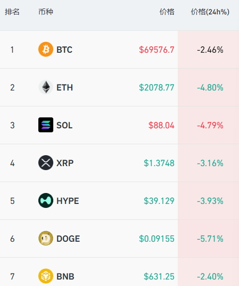 加密货币主要币种集体下跌,比特币失守7万美元关口,Coinglass数据显示,过去24小时,全市场超9万人爆仓。