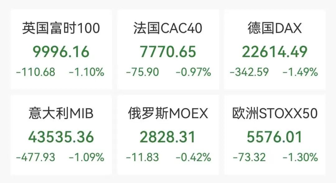 3月26日, 欧洲主要股市集体低开低走,截至发稿, 欧洲斯托克50指数跌1.3%, 德国DAX指数跌1.49%,英国富时100指数跌1.1%,法国CAC40指数跌0.97%。