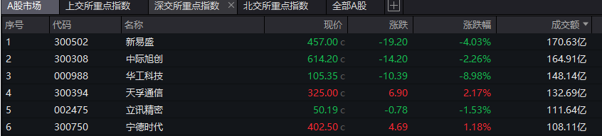 沪深两市成交额跌破2万亿元,较上一个交易日缩量2362亿元。个股方面,新易盛全天成交额超170亿元居首,中际旭创、华工科技、天孚通信、立讯精密等个股成交额均再110亿元以上。