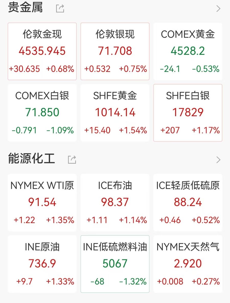 现货黄金白银微涨,WTI原油、布伦特原油均涨超1%。