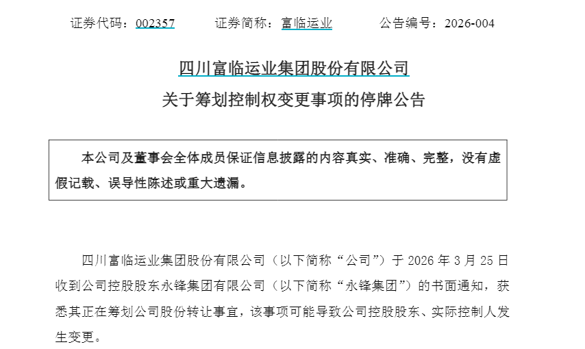 3月25日晚间,富临运业(002357)发布公告称,公司于当日收到控股股东永锋集团有限公司的书面通知,获悉其正在筹划公司股份转让事宜,该事项可能导致公司控股股东、实际控制人发生变更。