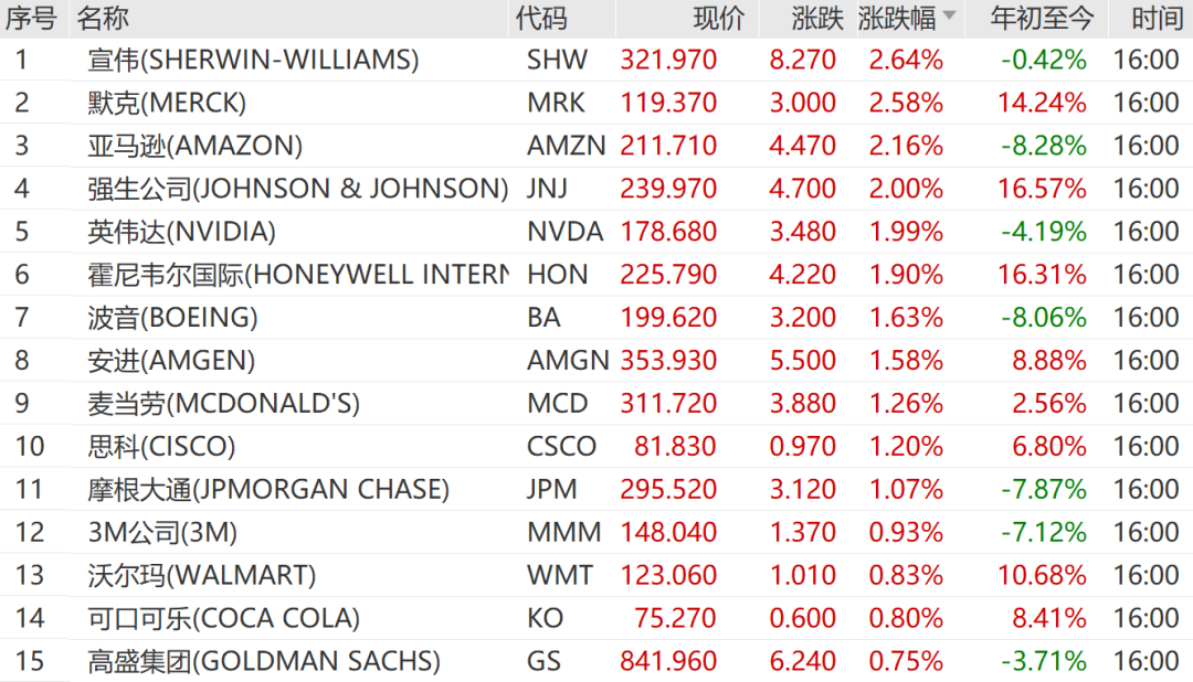 宣伟涨2.64%,默克涨2.58%,亚马逊涨2.16%,领涨道指成份股。