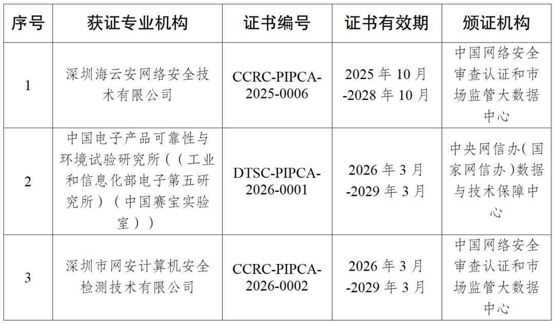 目前,我省已有3家机构通过认证,获得个人信息保护合规审计服务认证证书。具体名单如下: