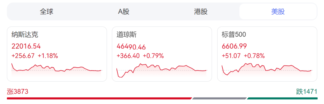 编辑| 陈柯名 杜恒峰 校对| 程鹏 北京时间25日晚, 美股三大指数集体高开,纳指涨1.12%,道指涨0.41%,标普500指数涨0.64%。 截至发稿, 纳指上涨1.18%,重返22000点。道指上涨0.79%,标普500指数上涨0.78%。市场上超3800只个股上涨。