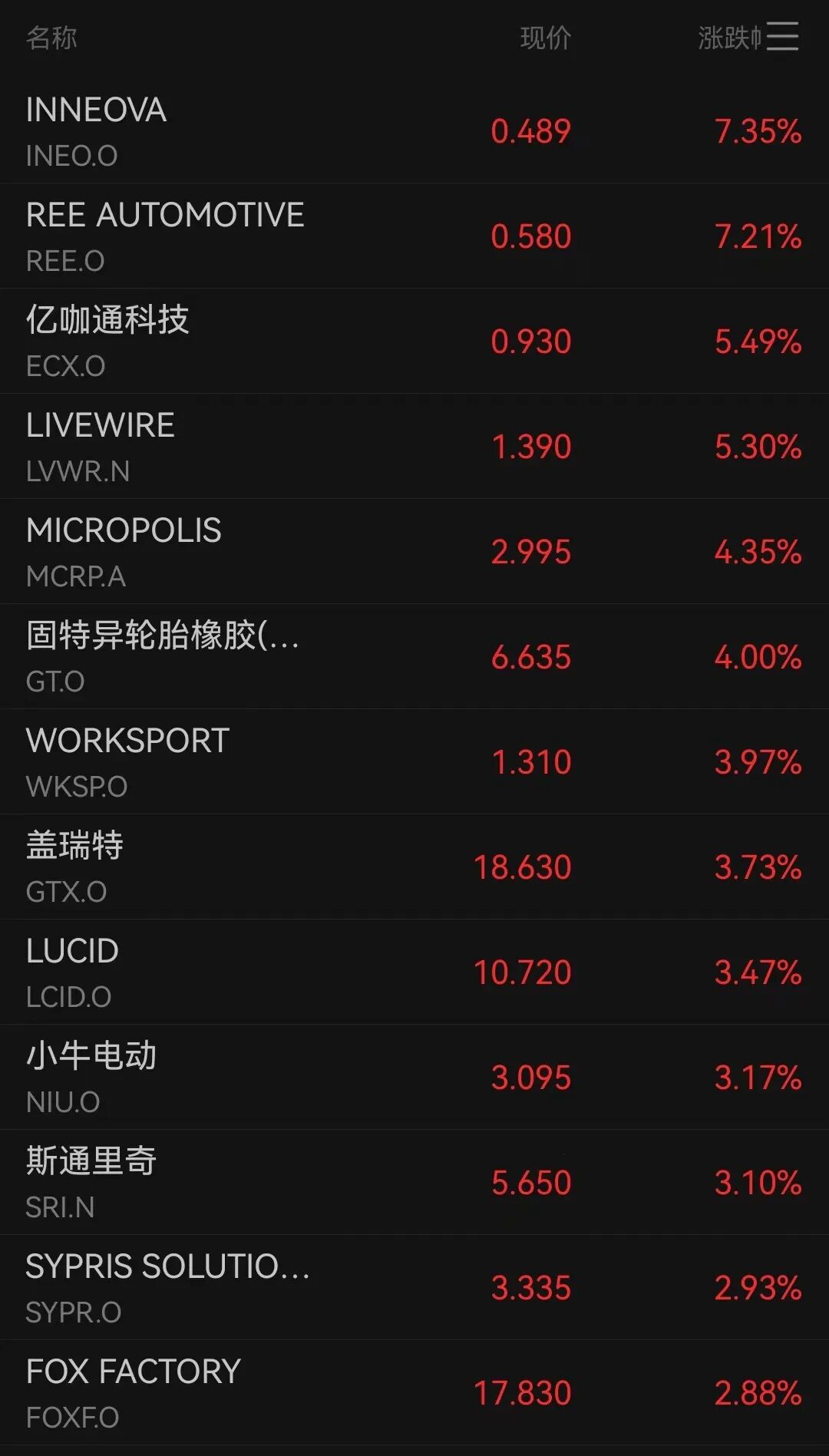 加密货币概念板块强势反弹,Circle、Robinhood、Cipher Digital涨超7%,Strategy、Coinbase、CleanSpark、BMNR涨超4%。 汽车与零配件板块走强,Inneova涨超7%,亿咖通科技涨超5%,盖瑞特、小牛电动涨超、斯通里奇涨超3%。