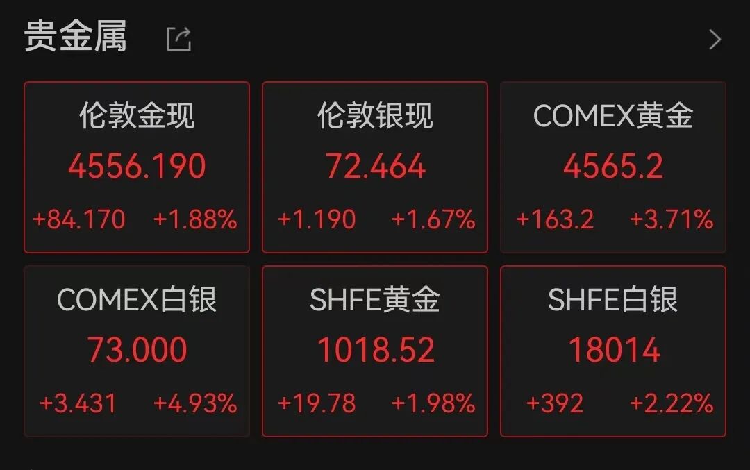 美 股存储板块集体走弱,美光科技跌4%,闪迪跌6.44%,西部数据跌幅4.43%,希捷科技跌6%。 美股黄金股集体上涨,伊格尔矿业、金罗斯黄金、泛美白银涨超4%,纽曼矿业、Barrick Mining、AU涨超3%。 贵金属方面,截至发稿,现货黄金涨1.88%,报4556.19美元/盎司;现货白银上涨1.67%,报72.464美元/盎司。