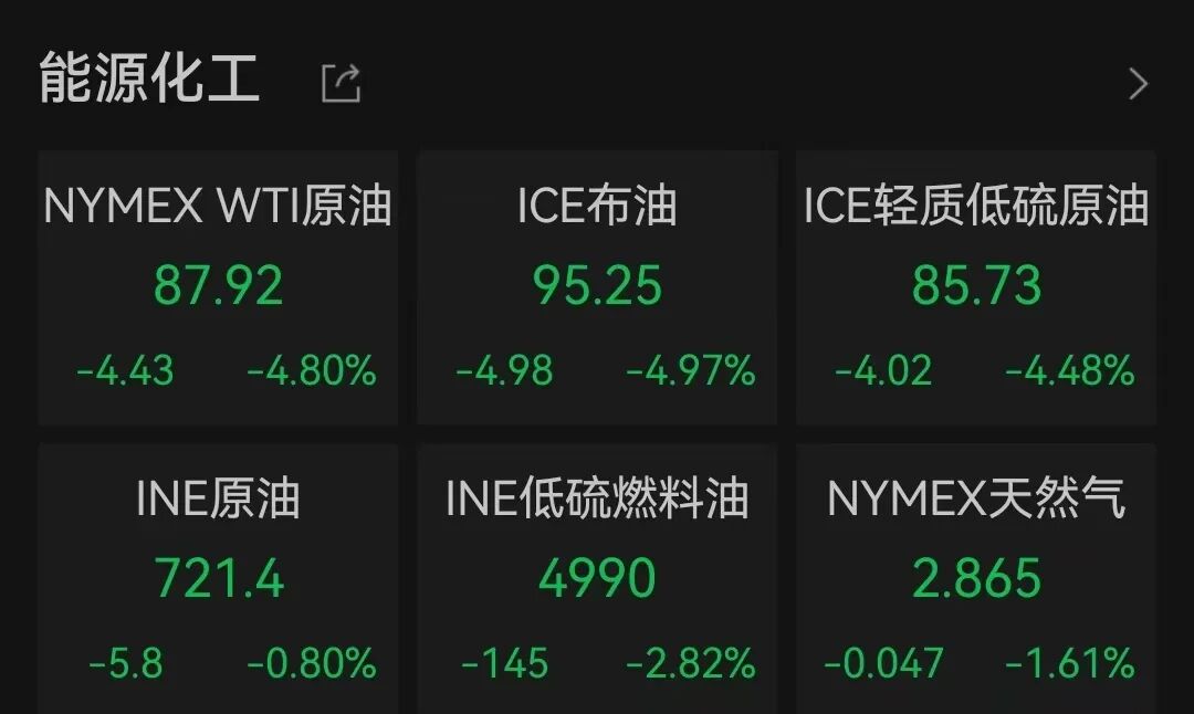 国际油价方面,美油、布油均跌超4%,分别报87.92美元/桶和95.25美元/桶。