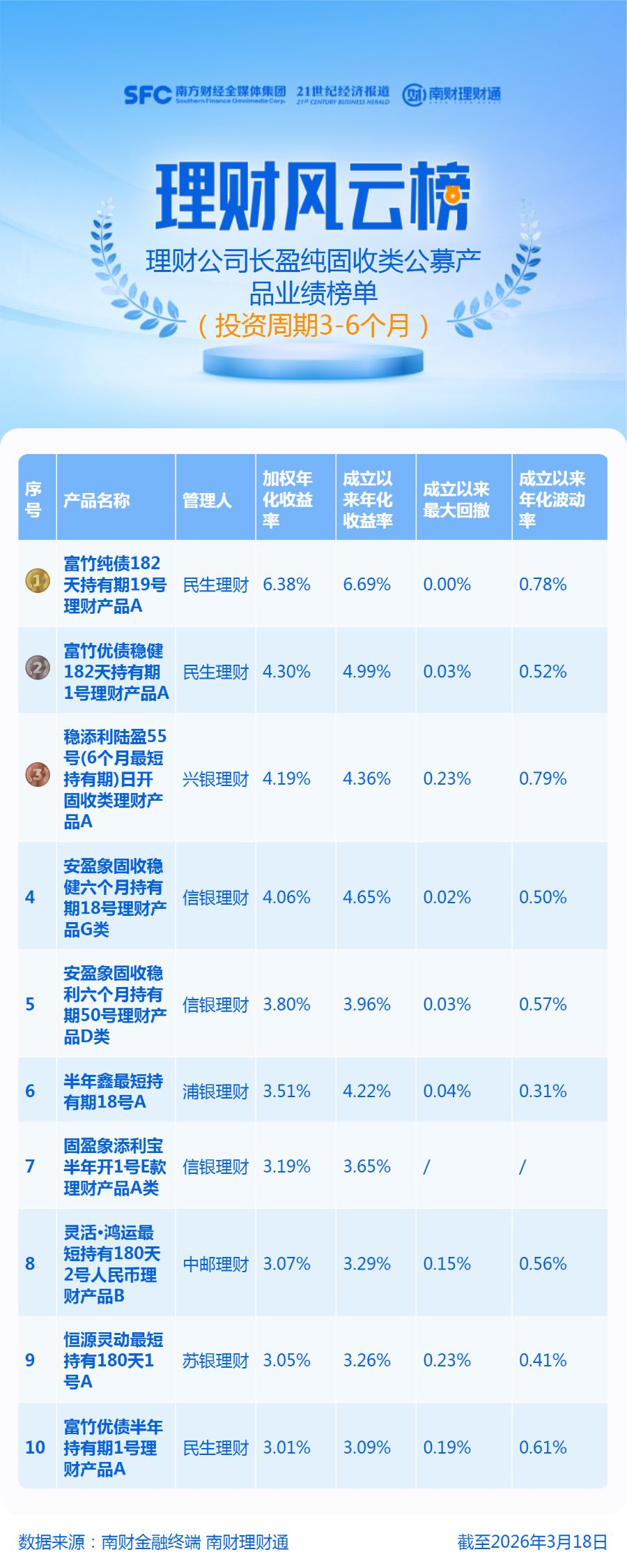 本期榜单统计对象为理财公司发行的成立满1年的公募纯固收产品,投资周期为3—6个月(含)期限,同系列同投资周期产品保留一只,加权年化收益率计算方式为“5%*近1月年化收益率+10%*近3月年化收益率+15%*近6月年化收益率+30%*近1年年化收益率+40%*成立以来年化收益率”,排名依据为加权年化收益率,数据计算截止时间为2026年3月18日。