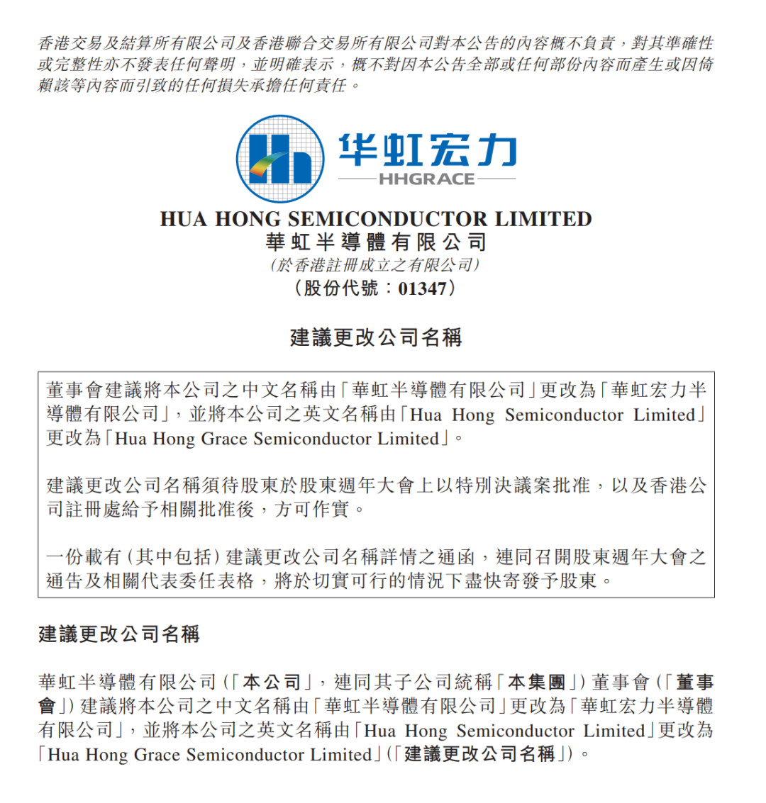 华虹半导体有限公司(华虹公司:688347.SH;华虹半导体:01347.HK)拟变更公司名称为“华虹宏力半导体有限公司”,变更证券简称为“华虹宏力”,证券代码保持不变。以上变更待有关单位批准后实施。