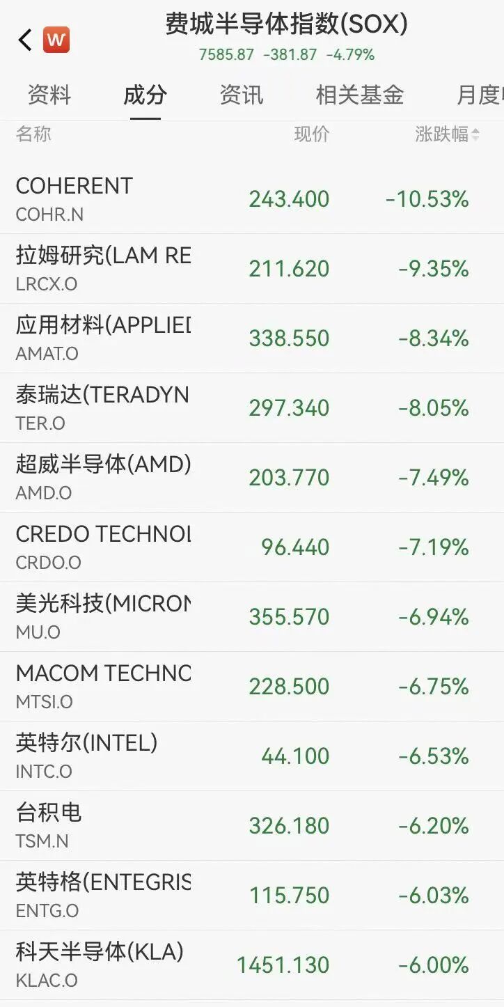 存储芯片股集体重挫,费城半导体指数跌近5%。闪迪跌超11%,拉姆研究、应用材料、希捷跌逾8%,超威半导体、西部数据跌逾7%。美光科技跌近7%,连续第6个交易日下跌,自3月18日历史高点已回撤超23%。