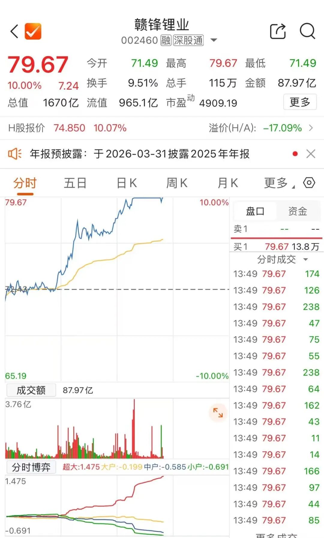 继昨日大涨后,3月27日午后,锂电产业链再度爆发,赣锋锂业涨停,报79.67元/股,总市值达1670亿元。 海科新源、川能动力、天原股份、石大胜华、维远股份封上涨停 , 盐湖股份涨超8%。此前,融捷股份早盘涨停,走出4连板。(详见锂电产业链大涨!002192,3连板)