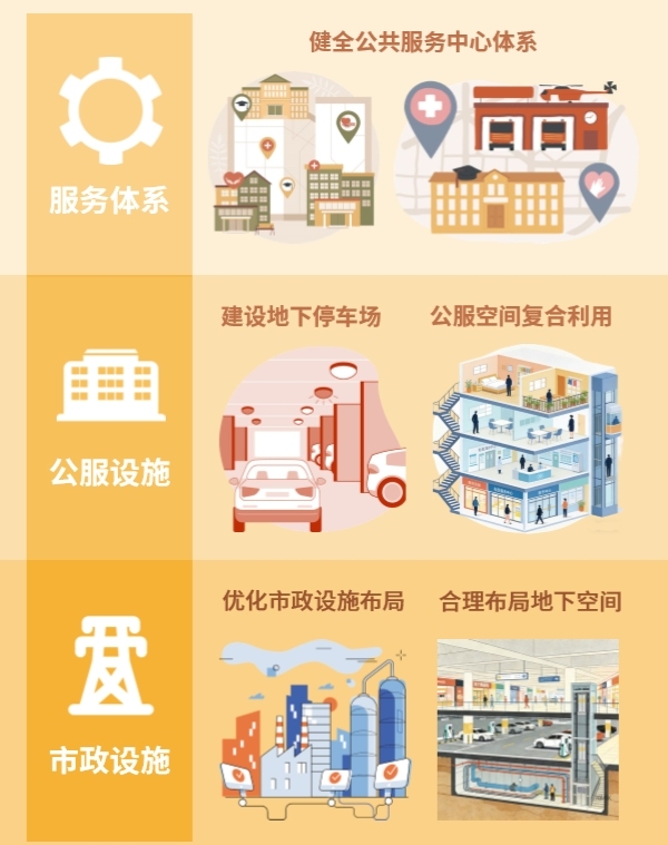 通过空间再优化、功能再完善、配套再提升,优化住房供应,推动公服设施均衡布局,重点推进轨道交通站点800米范围内低效用地再开发,为大型公服设施落地留足空间。
