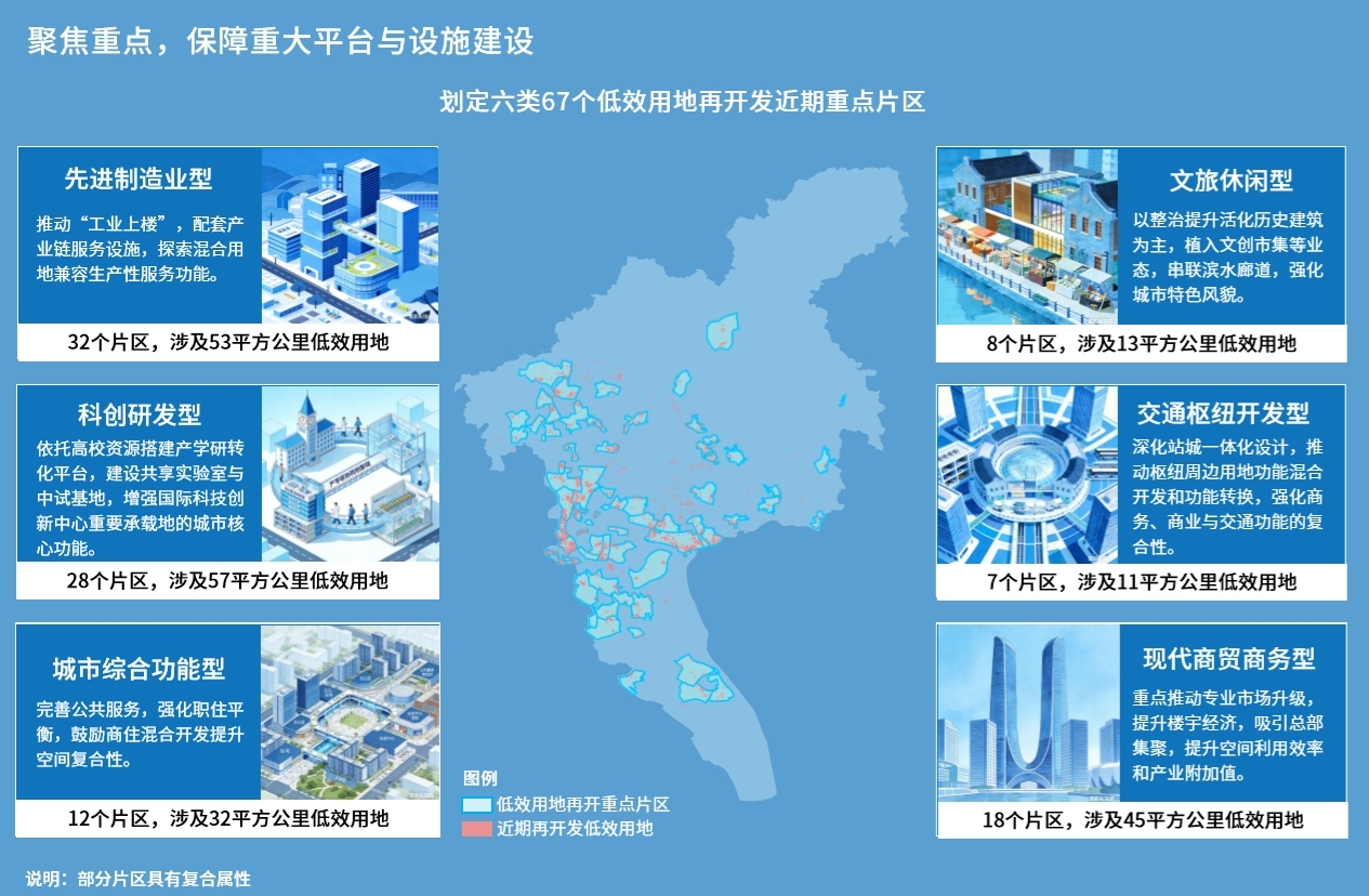 聚焦重点产业平台和产业集聚区,推动低效产业用地提质增效,完善生产、生活配套,促进数智化、绿色化转型。