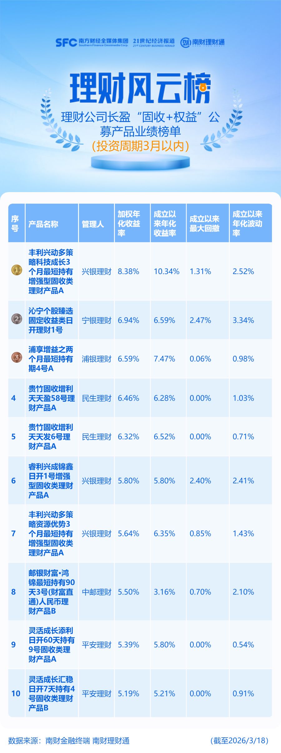 榜单数据说明:统计对象为理财公司发行的成立满1年的投资周期在3月以内(含)的公募“固收+权益”产品,同系列同投资周期产品保留一只,加权平均收益率计算方式为“5%×近1月年化收益率+10%×近3月年化收益率+15%×近6月年化收益率+30%×近1年年化收益率+40%×成立以来年化收益率”,排名依据为加权年化收益率,数据计算截止时间为2026年3月18日。榜单排名由理财通AI全自动化实时排名,如您对数据有疑问,请在文末联系助理进一步核实。
