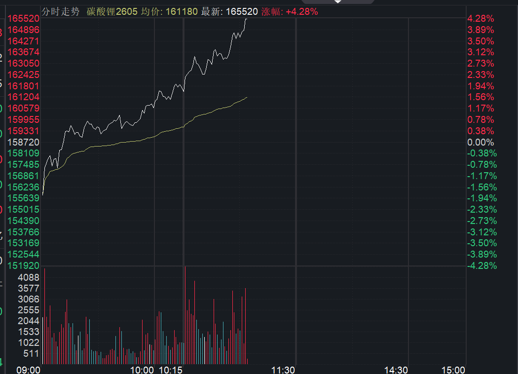 消息面上,广期所碳酸锂主力合约涨幅扩大,现涨超4%,日内突破16万元/吨,现报165520元/吨。