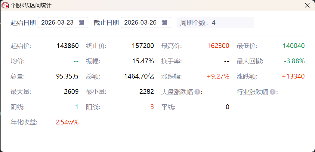 3月23日-26日4个交易日,广期所碳酸锂主力合约上涨,涨幅达9.27%,一度从14.4万元/吨涨至15.7万元/吨。