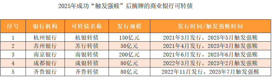 从2025年的市场来看,已有多只银行转债陆续退出市场。其中,齐鲁转债、南银转债、杭银转债、苏行转债、成银转债等因正股股价走强触发强赎条款而摘牌;中信转债、浦发转债则因到期而退出。