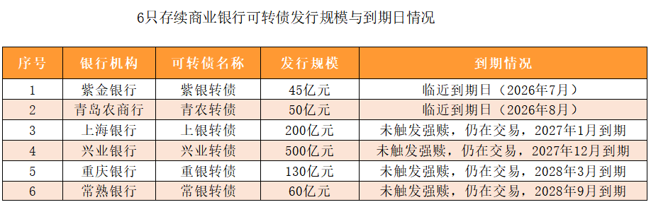 银行可转债的B面则是转股困难。数据显示,市场存续的银行转债数量已缩减至6只,规模降至千亿元以下,包括紫金银行、上海银行、常熟银行等6家机构: