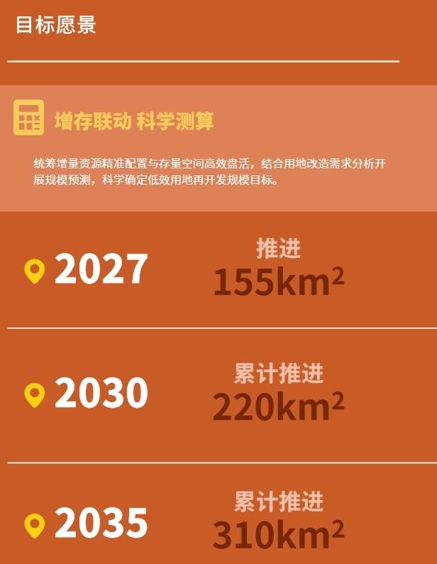 3月27日,《规划》新闻发布会介绍,《规划》是广州未来十几年存量发展的总纲领,也是全市低效用地再开发工作的行动指南。《规划》提出,到2027年,全市推进低效用地再开发155平方公里;到2030年,累计推进220平方公里;到2035年,累计推进310平方公里。